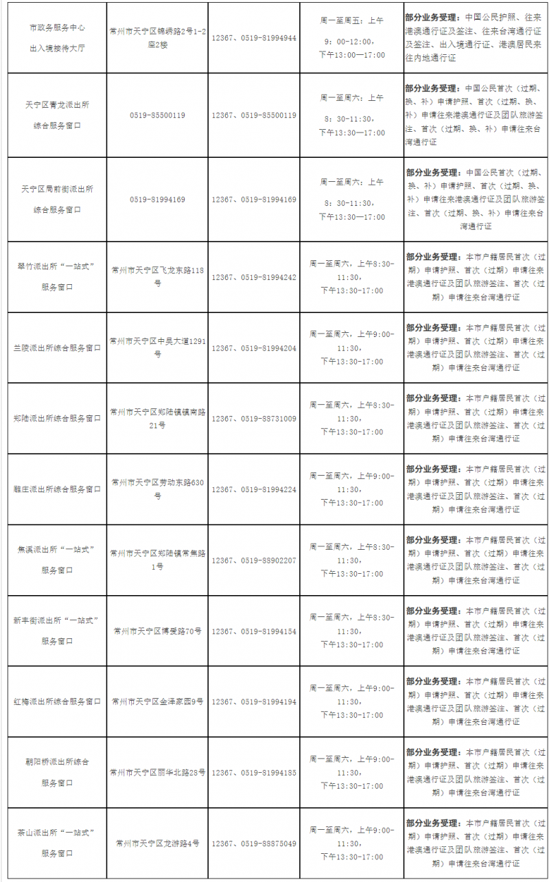 常州市天宁区出入境证件办理窗口地址、咨询电话及办理业务范围一览表: