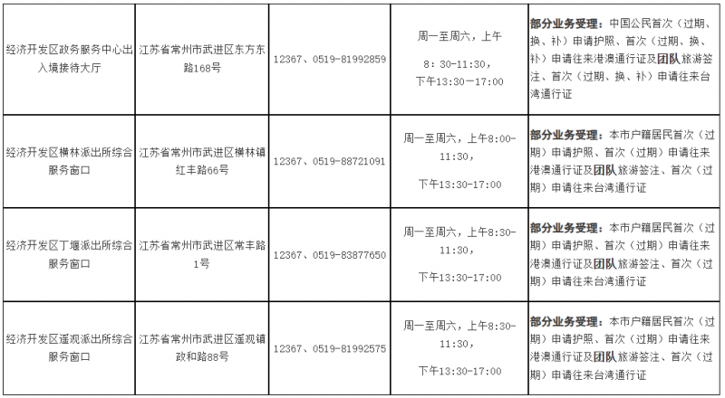 常州市经济开发区出入境证件办理窗口地址、咨询电话及办理业务范围一览表: