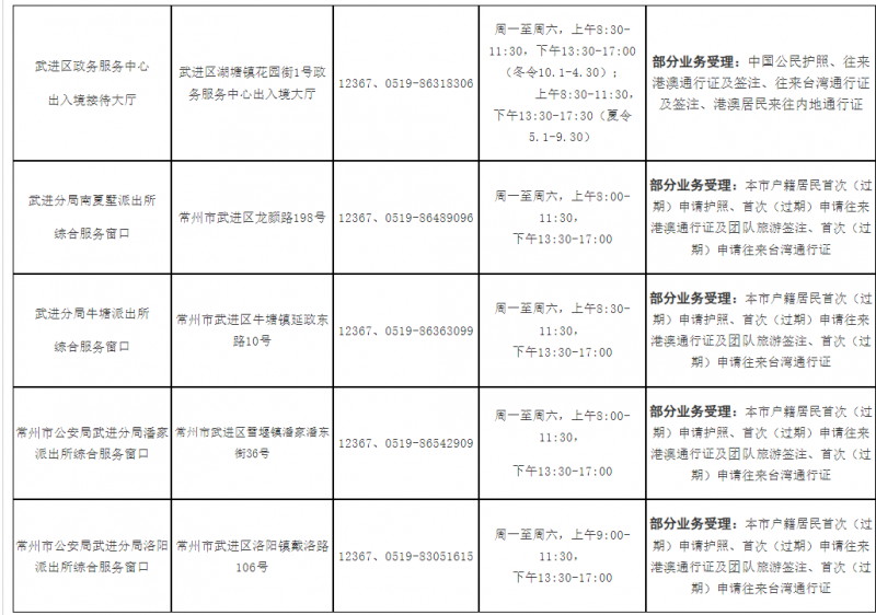 常州市武进区出入境证件办理窗口地址、咨询电话及办理业务范围一览表