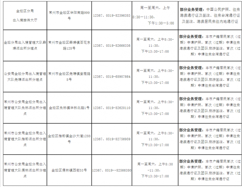 常州市金坛区出入境证件办理窗口地址、咨询电话及办理业务范围一览表: