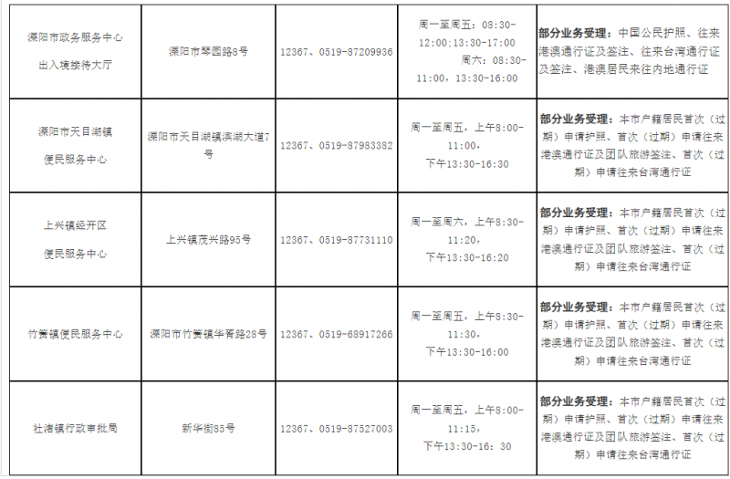 常州溧阳市出入境证件办理窗口地址、咨询电话及办理业务范围一览表: