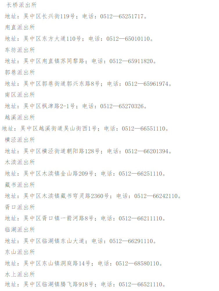 苏州市吴中区各派出所地址电话信息汇总列表: