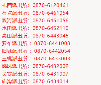 声明:关于昭通市威信县各派出所联系电话号码列表的信息作出免责声明,信息来源于当地主管部门公开之内容,整理转载此文是出于传递更多便民服务信息之目的。以上信息仅供参考,由于时间及其他方面的原因可能会发生变动,不准确之处请原谅!若有来源标注错误或者其它差错或侵犯了您的合法权益,请与本网站联系,我们将及时更正、删除。以上便民信息内容如有变更,以相关部门的更新内容为主。谢谢。