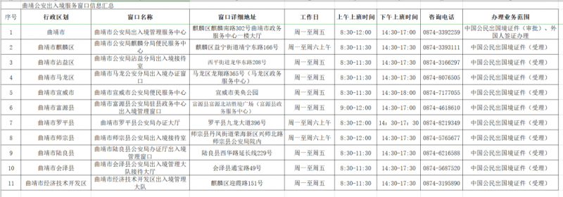 曲靖市辖区出入境业务受理窗口地址及咨询电话信息大全表。为更好地服务群众,曲靖市主管机构对辖区出入境管理部门对窗口信息进行了统一梳理。现公告如下: