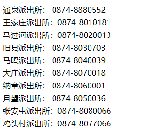 说明:关于曲靖市龙马县辖区派出所值班电话号码大全表的信息作出免责说明,信息来源于当地主管部门公开之内容,整理转载此文是出于传递更多便民服务信息之目的。若有来源标注错误或者其它差错或侵犯了您的合法权益,请与本网站联系,我们将及时更正、删除。以上内容如有变更,以相关部门的更新内容为主。谢谢。