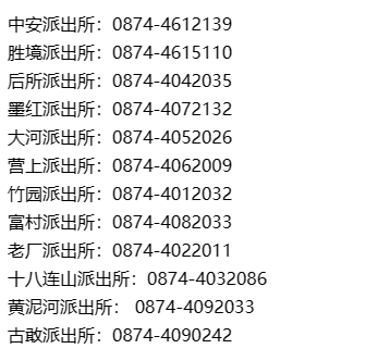 免责声明:关于曲靖市富源县辖区派出所值班电话号码一览表的信息作出免责声明,信息来源于当地主管部门公开之内容,整理转载此文是出于传递更多便民服务信息之目的。以上信息仅供参考,由于时间及其他方面的原因可能会发生变动,不准确之处请原谅!若有来源标注错误或者其它差错或侵犯了您的合法权益,请与本网站联系,我们将及时更正、删除。以上便民信息内容如有变更,以相关部门的更新内容为主。谢谢。