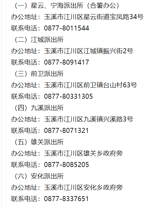 玉溪市江川区辖区派出所联系电话和办公地址信息大全表: