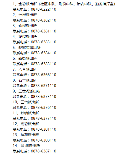 14、昙 华派出所联系电话:0878-6387110