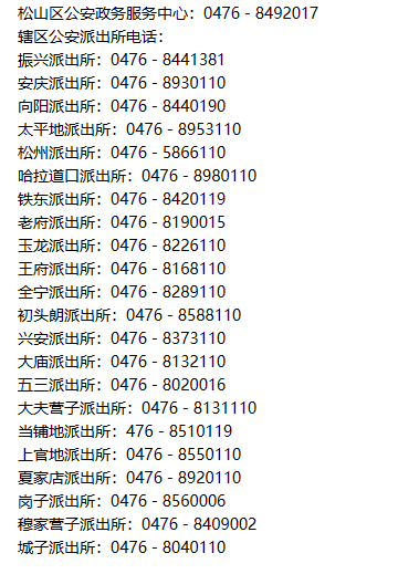 赤峰市松山区政务大厅及派出所户籍窗口咨询服务电话汇总表: