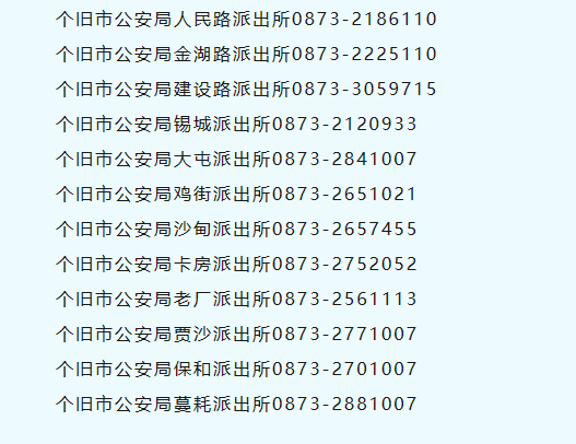 红河州个旧市辖区派出所值班电话号码汇总表: