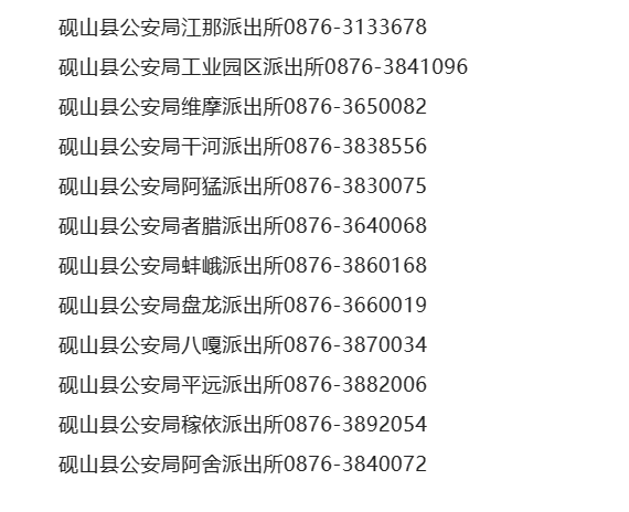 提示:关于文山州砚山县辖区派出所联系电话号码大全表的信息作出免责提示,信息来源于当地主管部门公开之内容,整理转载此文是出于传递更多便民服务信息之目的。若有来源标注错误或者其它差错或侵犯了您的合法权益,请与本网站联系,我们将及时更正、删除。以上内容如有变更,以相关部门的更新内容为主。谢谢。