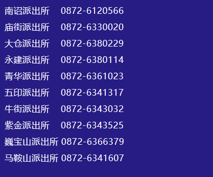 说明:关于大理州巍山县辖区派出所值班电话号码大全表的信息作出免责说明,信息来源于当地主管部门公开之内容,整理转载此文是出于传递更多便民服务信息之目的。若有来源标注错误或者其它差错或侵犯了您的合法权益,请与本网站联系,我们将及时更正、删除。以上内容如有变更,以相关部门的更新内容为主。谢谢。