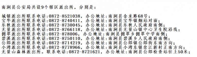 声明:关于大理州南涧县辖区派出所联系电话及办公地址信息大全表的信息作出免责声明,此信息来源于南涧县政府网站公开之内容,整理转载此文是出于传递更多便民服务信息之目的。若有来源标注错误或者其它差错或侵犯了您的合法权益,请与本网站联系,我们将及时更正、删除,谢谢。
