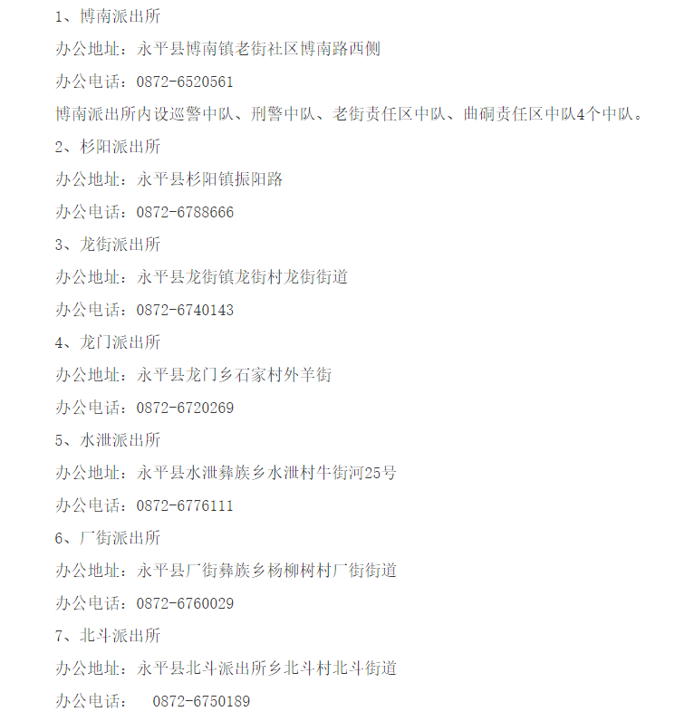 1、博南派出所,办公地址:永平县博南镇老街社区博南路西侧。办公电话:0872-6520561。