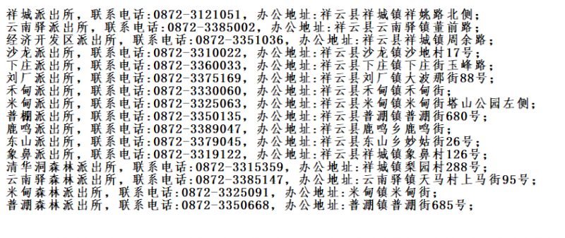大理州祥云县辖区派出所联系电话和办公地址信息一览表。祥云县辖区共设12个乡(镇)辖区派出所和4个森林派出所,分别是: