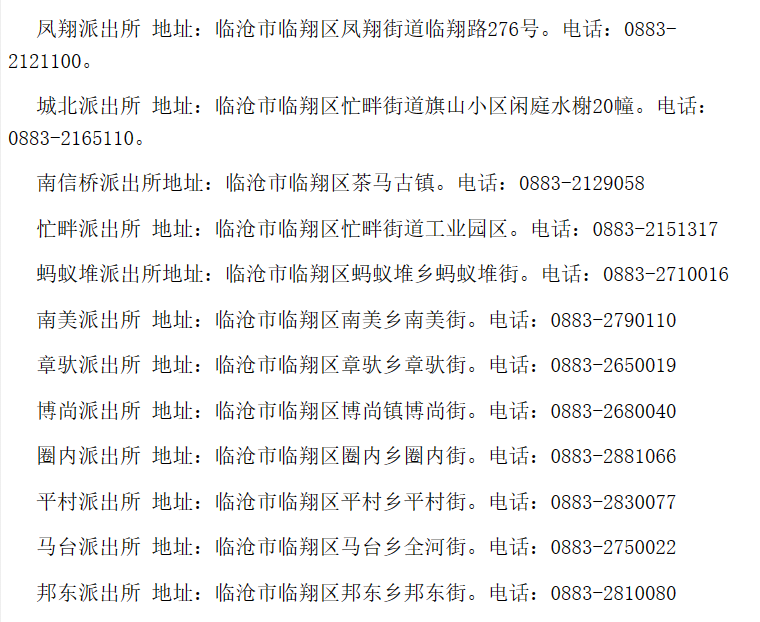 临沧市临翔区城北派出所 地址:临沧市临翔区忙畔街道旗山小区闲庭水榭20幢。电话:0883-2165110。