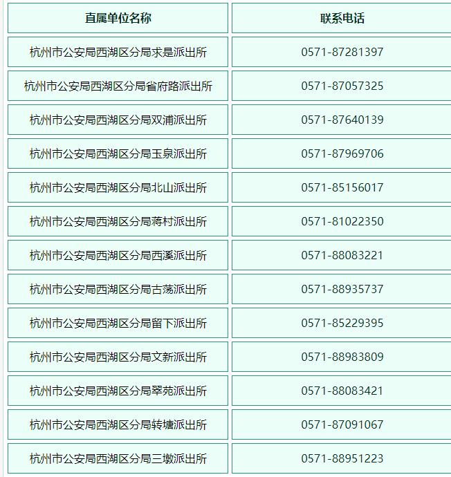 说明:关于杭州市西湖区辖区派出所联系电话号码大全表的信息作出免责说明,此信息来源于杭州市西湖区政府网站公开之内容,整理转载此文是出于传递更多便民服务信息之目的。若有来源标注错误或者其它差错或侵犯了您的合法权益,请与本网站联系,我们将及时更正、删除,谢谢。