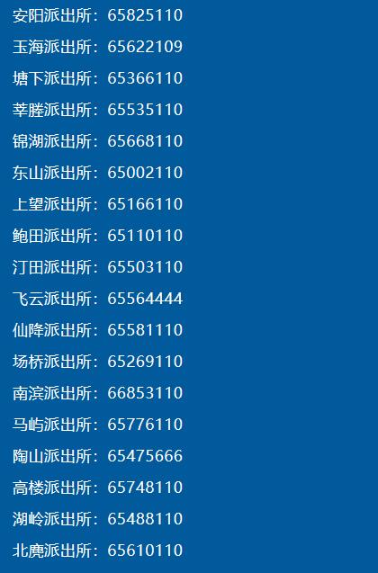 说明:关于温州瑞安市辖区派出所联系电话号码大全表的信息作出免责说明,信息来源于当地主管部门公开之内容,整理转载此文是出于传递更多便民服务信息之目的。若有来源标注错误或者其它差错或侵犯了您的合法权益,请与本网站联系,我们将及时更正、删除。以上内容如有变更,以相关部门的更新内容为主。谢谢。