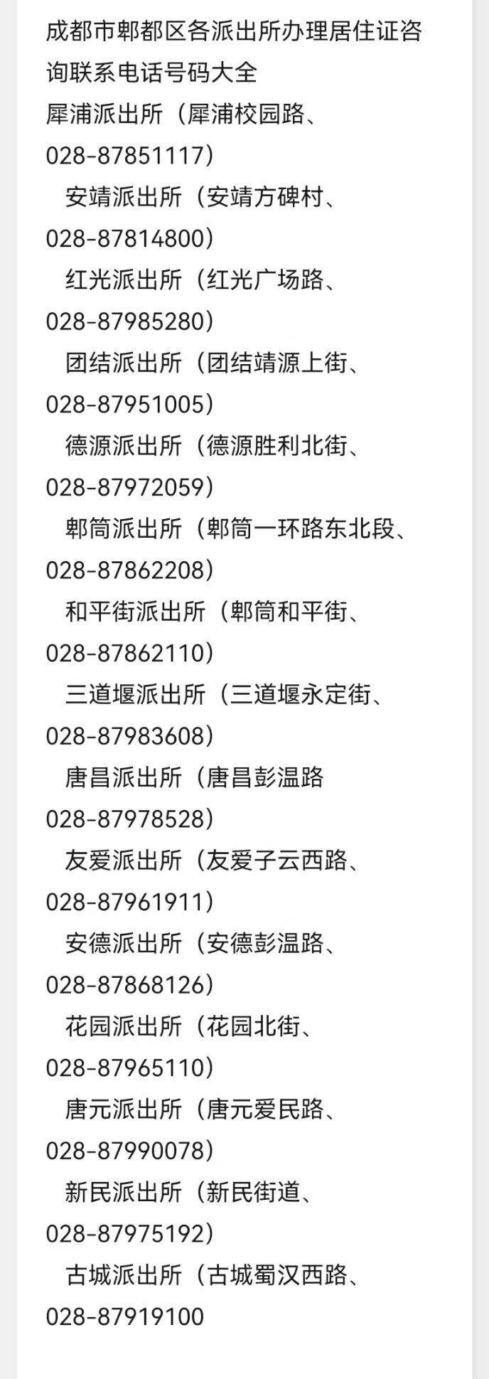 成都市郫都区各派出所办理居住证业务咨询联系电话号码大全表: