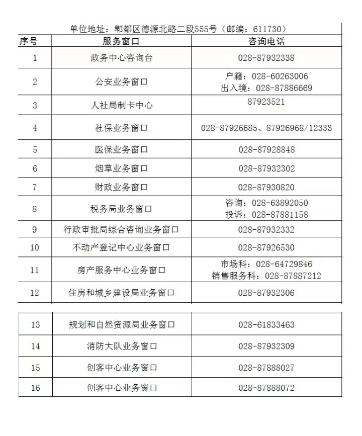 成都市郫都区政务服务中心各业务窗口咨询联系电话汇总表: