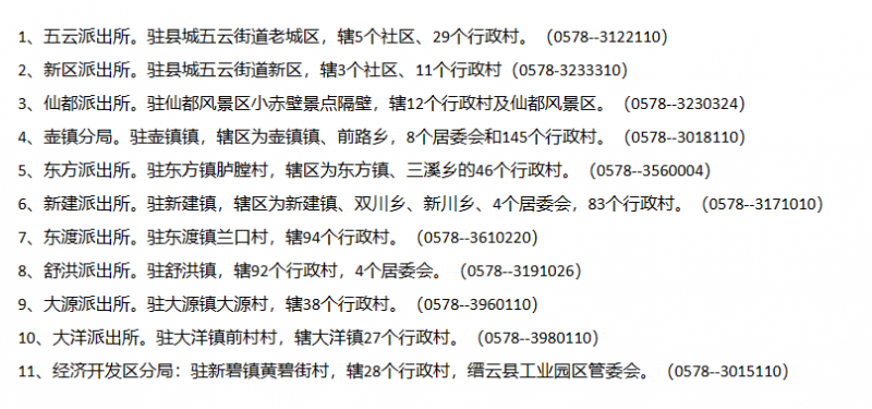 免责提示:关于丽水市缙云县辖区派出所值班电话和管辖区域信息大全表的信息作出免责提示,此信息来源于缙云县政府网站公开之内容,整理转载此文是出于传递更多便民服务信息之目的。若有来源标注错误或者其它差错或侵犯了您的合法权益,请与本网站联系,我们将及时更正、删除,谢谢。