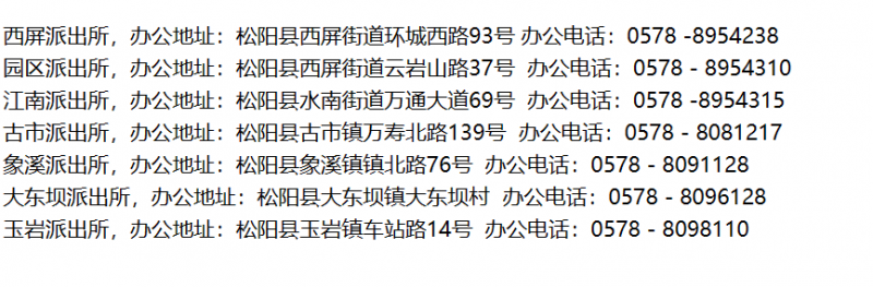说明:关于丽水市松阳县辖区派出所办公电话和办公地址信息大全表的信息作出免责说明,此信息来源于松阳县政府网站公开之内容,整理转载此文是出于传递更多便民服务信息之目的。若有来源标注错误或者其它差错或侵犯了您的合法权益,请与本网站联系,我们将及时更正、删除,谢谢。