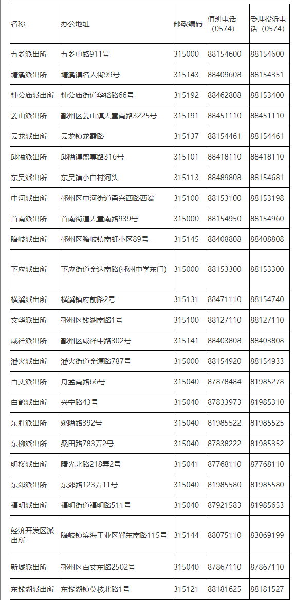 宁波市鄞州区辖区派出所值班电话、办公地址和投诉电话信息大全表:为维护群众利益、强化社会治安,有效分流和处置大量的非紧急求助,最大限度整合资源,及时回应群众通过拨打110反映的各类诉求,现将宁波市鄞州区辖区基层派出所值班电话号码和办公地址予以公布,群众可以通过派出所寻求帮助支持。