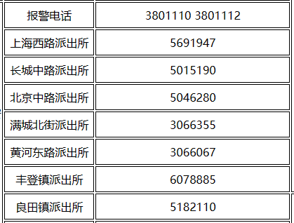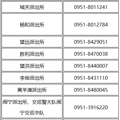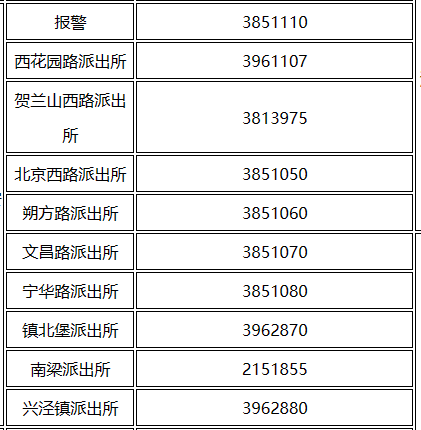银川市永宁县辖区派出所值班报警电话号码汇总表:
