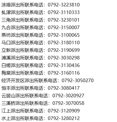 免责提示:关于九江市永修县辖区派出所联系电话号码汇总表的信息作出免责提示,此信息来源于永修县政府网站公开之内容,整理转载此文是出于传递更多便民服务信息之目的。若有来源标注错误或者其它差错或侵犯了您的合法权益,请与本网站联系,我们将及时更正、删除,谢谢。