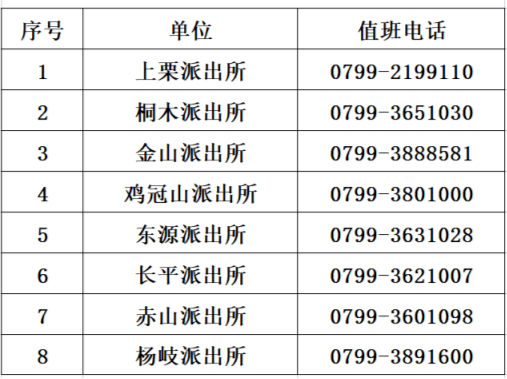 萍乡市上栗县各乡镇派出所值班电话大全表: