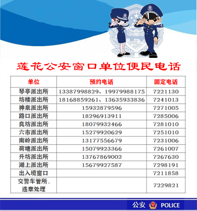 萍乡市莲花县各派出所、车管所、出入境窗口咨询预约电话汇总表: