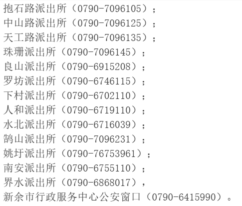 免责提示:关于新余市渝水区各派出所户政业务咨询预约电话大全表的信息作出免责提示,此信息来源于新余市渝水区政府网站公开之内容,整理转载此文是出于传递更多便民服务信息之目的。若有来源标注错误或者其它差错或侵犯了您的合法权益,请与本网站联系,我们将及时更正、删除,谢谢。