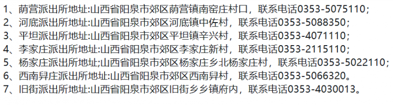 阳泉市郊区辖区派出所联系电话和地址信息汇总表: