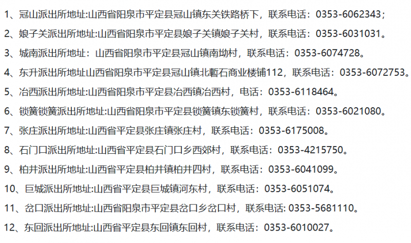 免责声明:关于阳泉市平定县辖区派出所地址和联系电话大全表的信息作出免责声明,此信息来源于阳泉市政府网站公开之内容,整理转载此文是出于传递更多便民服务信息之目的。若有来源标注错误或者其它差错或侵犯了您的合法权益,请与本网站联系,我们将及时更正、删除,谢谢。