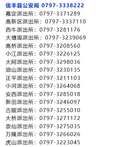 免责提示:关于信丰县辖区各派出所联系电话号码大全表的信息作出免责提示,信息来源于当地主管部门公开之内容,整理转载此文是出于传递更多便民服务信息之目的。若有来源标注错误或者其它差错或侵犯了您的合法权益,请与本网站联系,我们将及时更正、删除。以上内容如有变更,以相关部门的更新内容为主。谢谢。