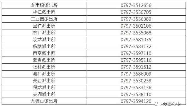 龙南市各派出所户籍窗口咨询联系电话号码汇总表: