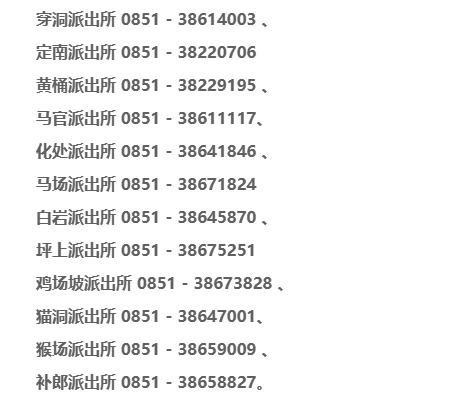说明:关于普定县各派出所户政业务咨询联系电话号码大全的信息作出免责说明,此信息来源于普定县政府网站公开之内容,整理转载此文是出于传递更多便民服务信息之目的。若有来源标注错误或者其它差错或侵犯了您的合法权益,请与本网站联系,我们将及时更正、删除,谢谢。