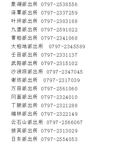 说明:关于赣州瑞金市辖区派出所值班电话号码汇总表的信息作出免责说明,信息来源于当地主管部门公开之内容,整理转载此文是出于传递更多便民服务信息之目的。若有来源标注错误或者其它差错或侵犯了您的合法权益,请与本网站联系,我们将及时更正、删除。以上内容如有变更,以相关部门的更新内容为主。谢谢。