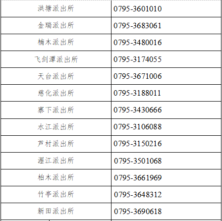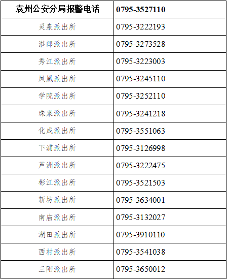 说明:关于宜春市袁州区辖区派出所报警电话号码大全表的信息作出免责说明,信息来源于宜春市袁州区政府主管部门公开之内容,整理转载此文是出于传递更多便民服务信息之目的。以上信息仅供参考,由于时间及其他方面的原因可能会发生变动,不准确之处请原谅!若有来源标注错误或者其它差错或侵犯了您的合法权益,请与本网站联系,我们将及时更正、删除。以上便民信息内容如有变更,以相关部门的更新内容为主。谢谢。