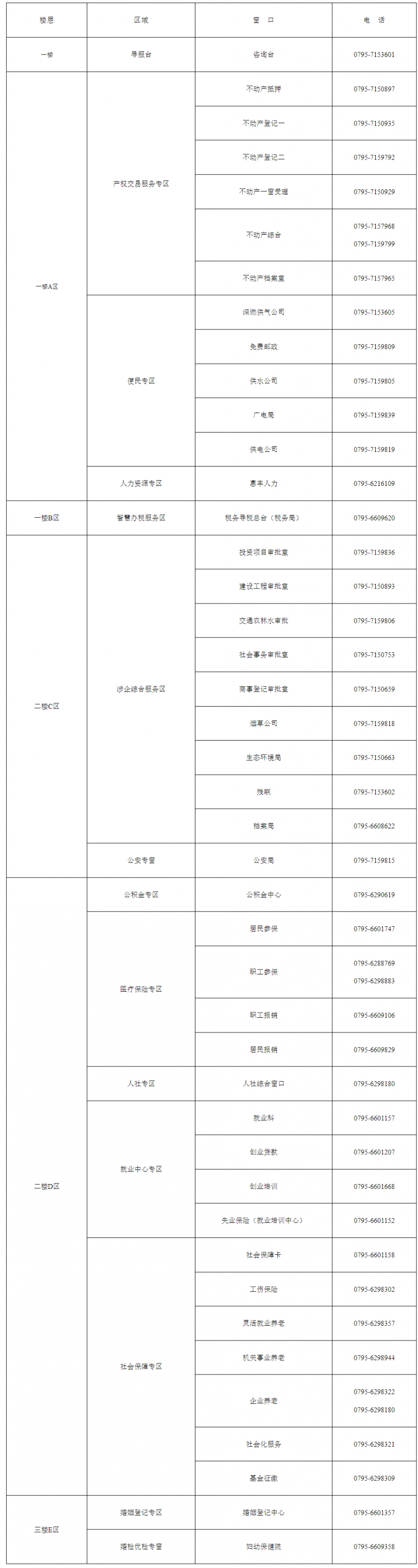 免责提示:关于丰城市政务服务中心大厅各单位业务窗口咨询联系电话号码大全表的信息作出免责提示,信息来源于丰城市政府主管部门网站公开之内容,整理转载此文是出于传递更多便民服务信息之目的。以上信息仅供参考,由于时间及其他方面的原因可能会发生变动,不准确之处请原谅!若有来源标注错误或者其它差错或侵犯了您的合法权益,请与本网站联系,我们将及时更正、删除。以上便民信息内容如有变更,以相关部门的更新内容为主。谢谢。