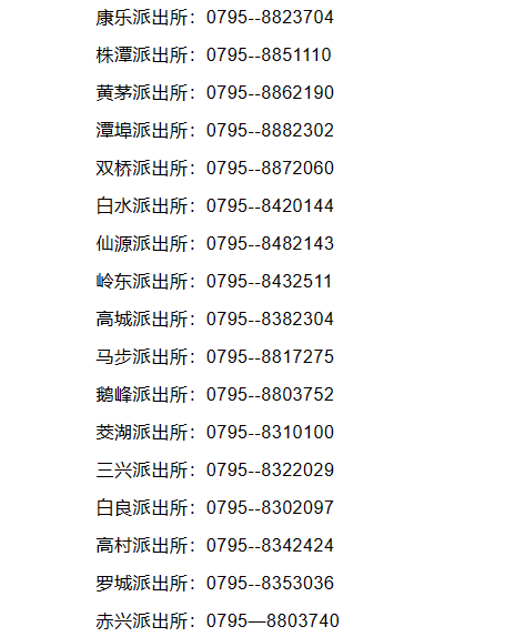 宜春市万载县辖区派出所值班电话号码大全表:康乐派出所、株潭派出所、黄茅派出所、潭埠派出所、双桥派出所、白水派出所、仙源派出所、岭东派出所、高城派出所、马步派出所、鹅峰派出所、茭湖派出所、三兴派出所、白良派出所、高村派出所、罗城派出所、赤兴派出所。