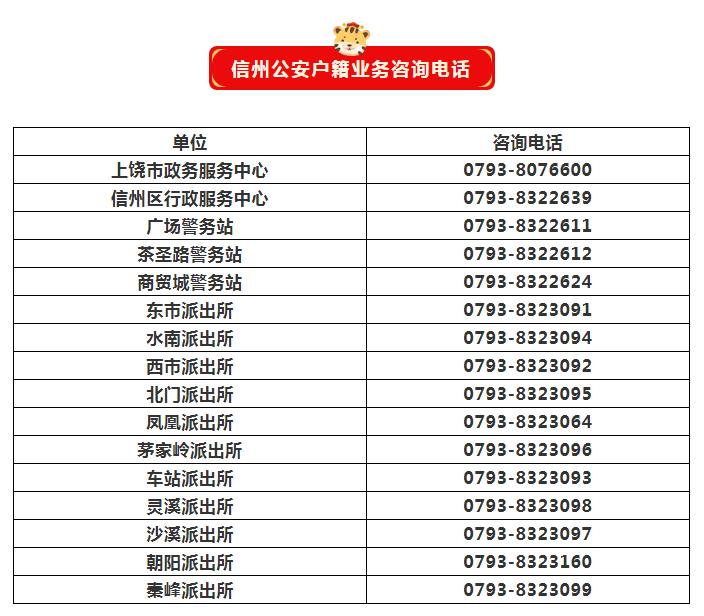 上饶市信州区各派出所户籍业务咨询电话号码大全表:上饶市信州区辖区各派出所窗口单位将科学安排好值班备勤工作,提供预约受理服务,并安排人员及时做好业务受理和办理工作,确保群众能够正常办理户籍业务。如您需要预约相关业务办理,或对业务办理所需材料存在疑问的,可以提前联系对应辖区户籍窗口咨询详情哦。