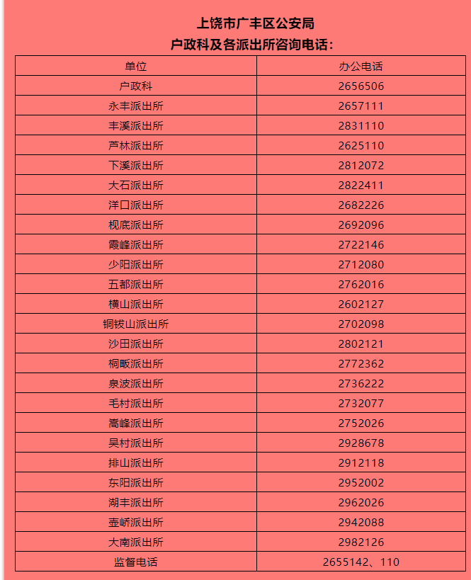提示:关于上饶市广丰区各派出所和户政科户籍业务咨询电话号码大全表的信息作出免责提示,信息来源于上饶市广丰区主管部门公开之内容,整理转载此文是出于传递更多便民服务信息之目的。若有来源标注错误或者其它差错或侵犯了您的合法权益,请与本网站联系,我们将及时更正、删除。以上内容如有变更,以相关部门的更新内容为主。谢谢。