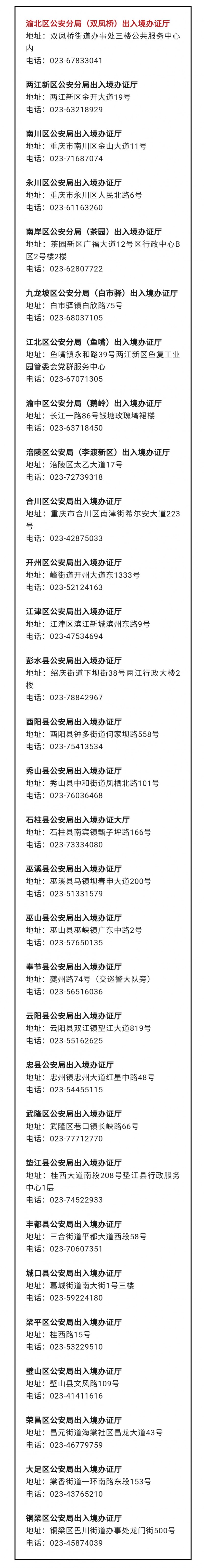 重庆市全市辖区出入境接待办证大厅地址电话大全表:
