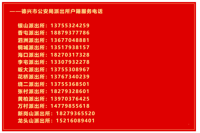德兴市辖区派出所户籍业务服务电话大全表:为打造良好的营商环境,方便群众办理户口、出入境、车驾管等业务,德兴市全面落实“优化营商环境”便民利民惠民举措,积极推行延时服务。为方便广大人民群众办证办事,特此公开全市各派出所户籍窗口服务电话,需要办理业务的小伙伴可以提前打电话咨询预约哦。