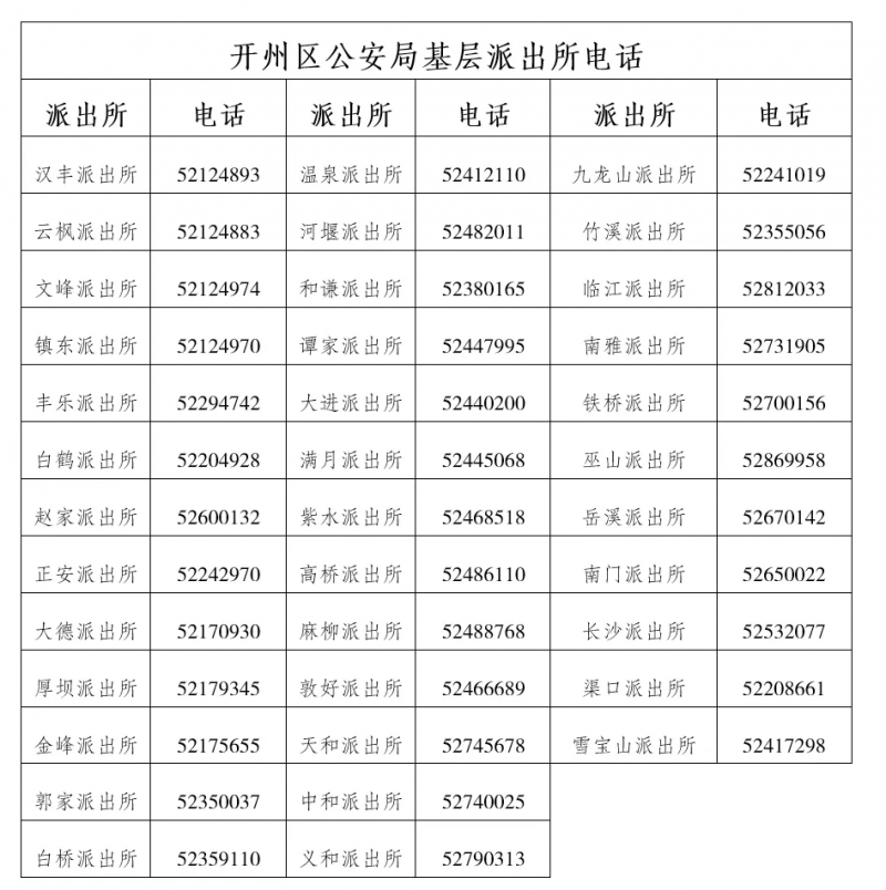 重庆市开州区基层派出所电话号码大全表:平安开州,离不开您的支持和参与,让我们一起携手,共同维护开州社会治安大局的持续稳定!