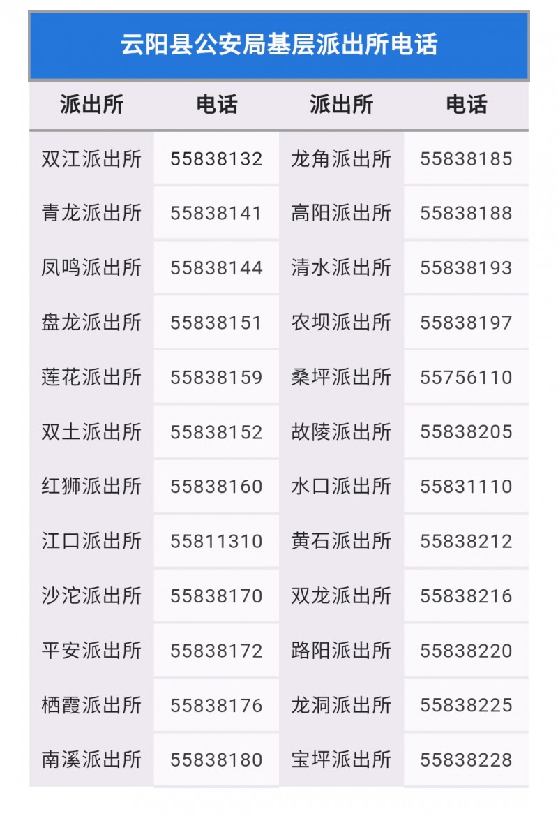 提示:关于重庆市云阳县基层派出所联系电话汇总表的信息作出免责提示,信息来源于当地主管部门公开之内容,整理转载此文是出于传递更多便民服务信息之目的。若有来源标注错误或者其它差错或侵犯了您的合法权益,请与本网站联系,我们将及时更正、删除。以上内容如有变更,以相关部门的更新内容为主。谢谢。