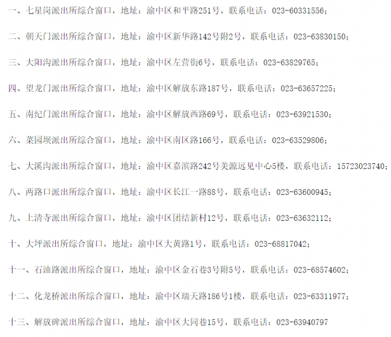 重庆市渝中区具体受理承办户籍业务派出所窗口的名称、地址、联系电话:接待时间:工作日工作时间, 9:00—12:30,14:00—18:00(法定节假日除外)。