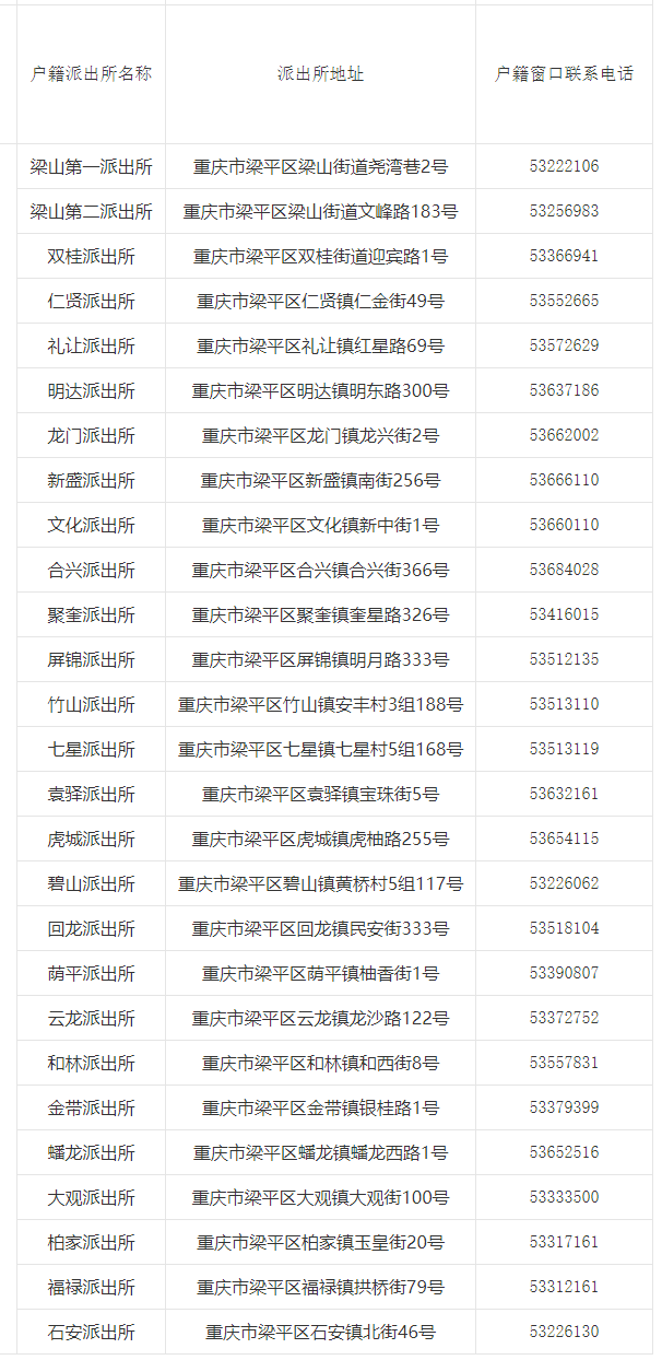 重庆市梁平区辖区派出所户籍窗口联系电话及地址信息汇总表:重庆市梁平区辖区各派出所户籍窗口将以坚决的态度、严格的举措、暖心的行动、无畏的担当,为全区群众提供便捷的服务。电话号码的区号为023.