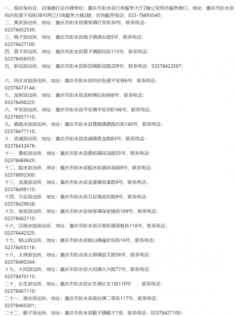 免责说明:关于重庆市彭水县辖区派出所户籍窗口联系电话和地址大全表的信息作出免责说明,此信息来源于彭水县政府网站公开之内容,整理转载此文是出于传递更多便民服务信息之目的。若有来源标注错误或者其它差错或侵犯了您的合法权益,请与本网站联系,我们将及时更正、删除,谢谢。